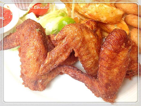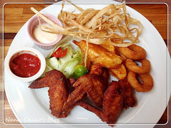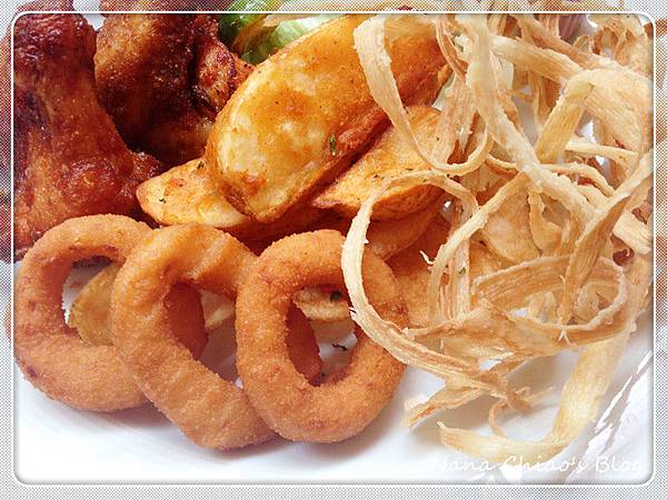 總共有五樣 ➜炸雞翅、炸薯片、洋蔥圈、薯條、牛蒡絲