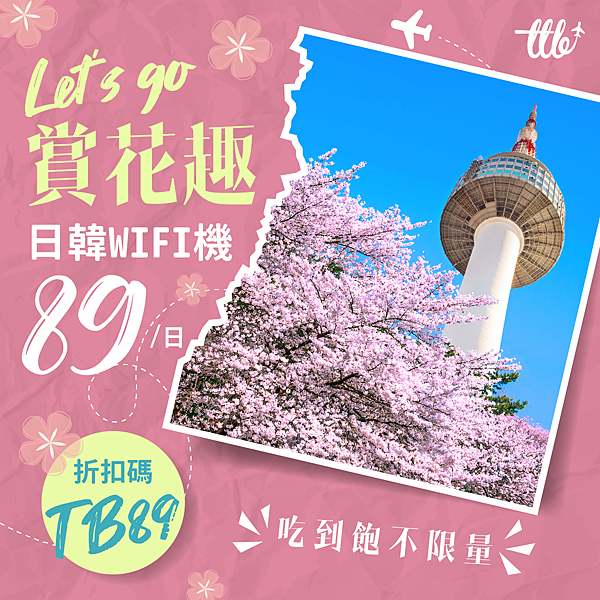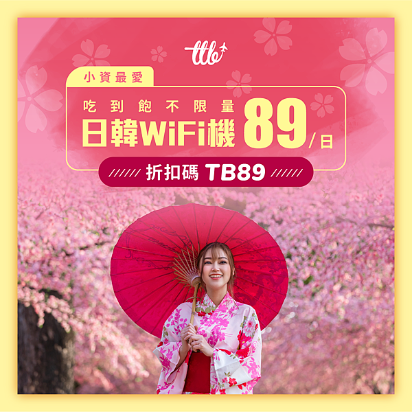 輸入專屬折扣碼TB89,日本/韓國一天只要89元