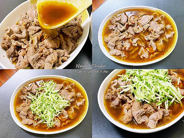 ▶牛肉片用些許醬油、香油、太白粉抓勻醃漬約30分鐘,川燙後,鋪在豆芽菜上面