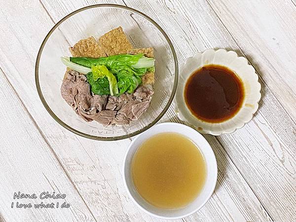 接著川燙想吃的配料,我準備的是油豆腐、小白菜跟肉片,燙熟後將配料放在麵體上