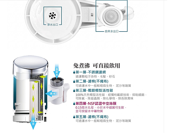 第四層:NSF認證中空絲膜濾材的孔徑在0.15微米,小於水中細菌,可保留水中礦物質