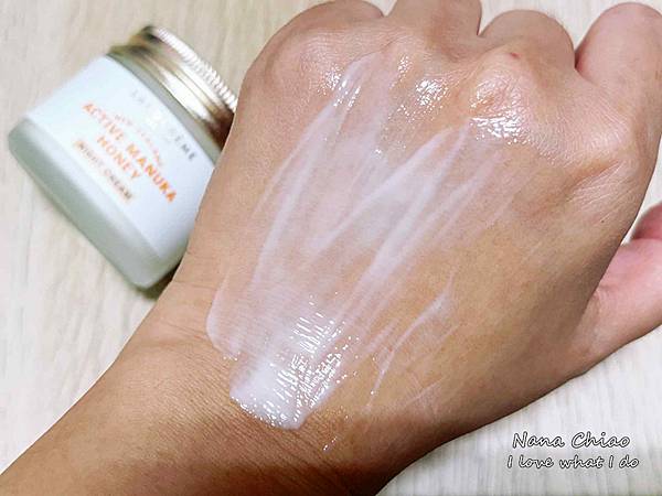 麥蘆卡蜂蜜賦活晚霜的質地不會過於厚重,一抹就能感受到潤澤度,使用後不油膩,膚感很好